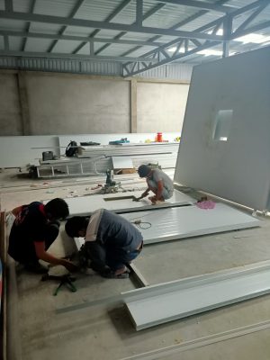 Sau khi định vị các tấm Panel EPS vào khung, tiến hành lắp ráp và cố định chúng bằng vít. Việc lắp đặt cần đảm bảo các tấm panel được ghép khít với nhau để tránh khe hở, đảm bảo tính cách âm, cách nhiệt tối đa.